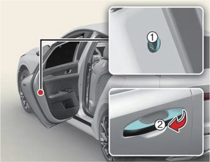 To open the rear door, pull the outside door handle (2).