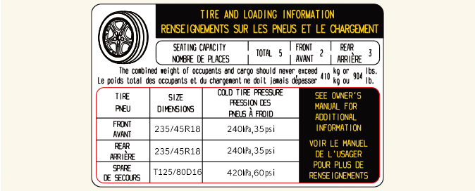 The label located on the driver's door sill gives the original tire size, cold tire pressures recommended for your vehicle, the number of people that can be in your vehicle and vehicle capacity weight.