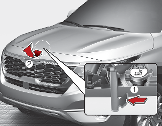 Go to the front of the vehicle, raise the hood slightly, push the secondary latch (1) right sideways and lift the hood (2).