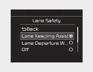 The driver can change Lane Keeping Assist to Lane Departure Warning or change Lane Keeping Assist mode from the LCD display or infotainment system display. Go to the 'User Settings → Driver Assistance → Lane Safety → Lane Keeping Assist/Lane Departure Warning/Off'.