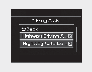 With the engine ON, Navigation-based Smart Cruise Control turns on and gets ready to be activated when you press SETUP button of the infotainment system and select 'Driver Assistance → Driving Assist → Highway Auto Curve Slowdown' in the infotainment system display. You can turn off the function by deselecting it. The set-up of Navigation-based Smart Cruise Control will be maintained, as selected, when the engine is re-started.