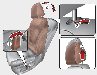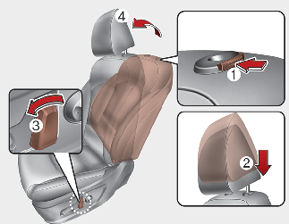 Appuyez sur le bouton de déverrouillage (3) en tirant l'appuie-tête vers le haut (4).