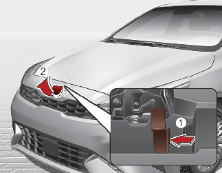 Passez à l’avant du véhicule, levez légèrement le capot, poussez le second loquet (1) vers le haut et levez le capot (2).