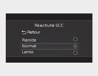 La sensibilité de vitesse de consigne lorsque vous suivez un autre véhicule peut être réglée pour maintenir la distance sélectionnée. Avec le commutateur d'allumage ou le bouton ENGINE START/STOP (démarrage/arrêt du moteur) en position ON (marche), sélectionnez « Driver Assistance (Assistance au conducteur) → SCC Reaction (Réaction SCC) » depuis le menu « User Settings (Paramètres utilisateur) (Affichage LCD) » pour définir laquelle des trois étapes vous préférez.