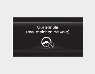 Si le conducteur n’a toujours pas les mains sur le volant après le rappel, le message « Aide au suivi de voie (LFA) annulée » apparaît et l’aide au suivi de voie est automatiquement annulée.