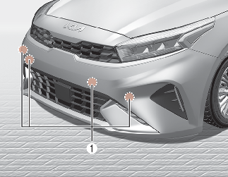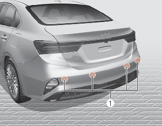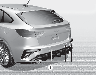 L'avertissement de distance de stationnement en marche avant/arrière avertira le conducteur par un voyant d'avertissement ou un son si une personne, un animal ou un objet dans une certaine plage est détecté par les capteurs à ultrasons avant/arrière (1) lorsque le véhicule avance ou recule à basse vitesse.