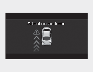 Lorsqu'un véhicule arrivant par l'arrière est détecté au moment où une portière s'ouvre, le message d'avertissement "Attention au trafic" apparaîtra dans le combiné d'instruments, le témoin s'allumera sur le rétroviseur extérieur et un signal sonore retentira.