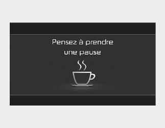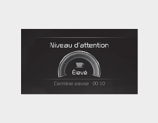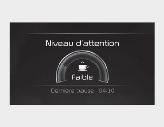 Le message « Envisagez de faire une pause » s’affiche dans le combiné d’instruments et un signal sonore retentit pour suggérer au conducteur de faire une pause, lorsque son niveau d’attention est inférieur à 1.