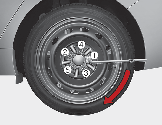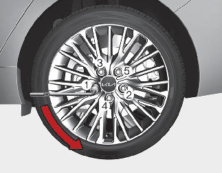 Placer ensuite la clé comme illustré et serrer les écrous de roue. La douille doit être bien engagée sur l’écrou. Ne pas monter sur la poignée de la clé et ne pas utiliser de tuyau d’échantillon sur la poignée de la clé. Fermeture de la roue en serrant chaque écrou successivement jusqu’à ce qu’ils soient tous serrés. Confirmer ensuite le serrage de chaque écrou. Après un changement de roue, faire vérifier le système par un atelier professionnel. Kia recommande de consulter un concessionnaire/réparateur agréé Kia.