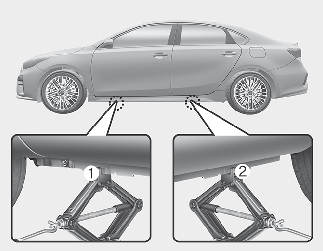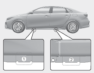 Placez le cric à la position de mise sur cric avant (1) ou arrière (2) la plus proche du pneu à remplacer. Placer le cric aux emplacements désignés sous la voiture. Les positions de mise sur cric sont des plaques soudées au châssis avec deux onglets et un ergot d’indexation du cric.