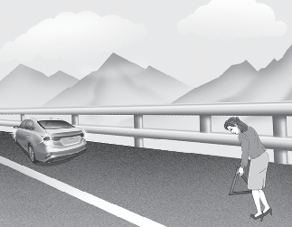 Pour éviter que le véhicule ne se déplace pendant le remplacement de pneu, toujours serrer complètement le frein de stationnement et toujours bloquer la roue dans le point opposé de la roue remplacée.