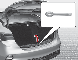 Ouvrez le coffre/hayon et retirez le crochet de remorquage de la boîte à outils.