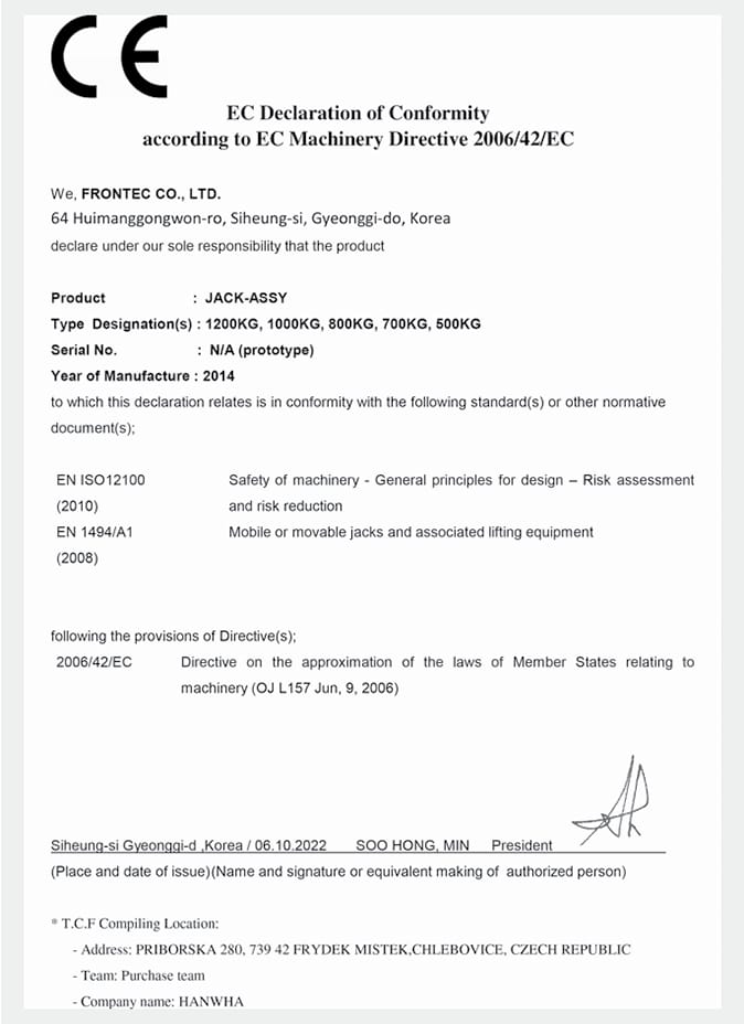 Domov > Čo robiť v prípade núdze > V prípade defektu (s rezervnou pneumatikou) > Vyhlásenie o zhode EK pre zdvihák
