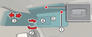 • Чтобы воспользоваться зеркальцем, опустите солнцезащитный козырек вниз и сдвиньте крышку (4).