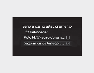 Com o botão ENGINE START/STOP (Ligar/desligar o motor) na posição ON (Ligado), selecione "Driver Assistance (Assistência ao condutor) → Parking Safety (Segurança no estacionamento) → Rear Cross-Traffic Safety (Segurança de tráfego cruzado à retaguarda)" no menu Settings (Definições) para ativar a Assistência à prevenção de colisão traseira e desmarque para desativar a função.