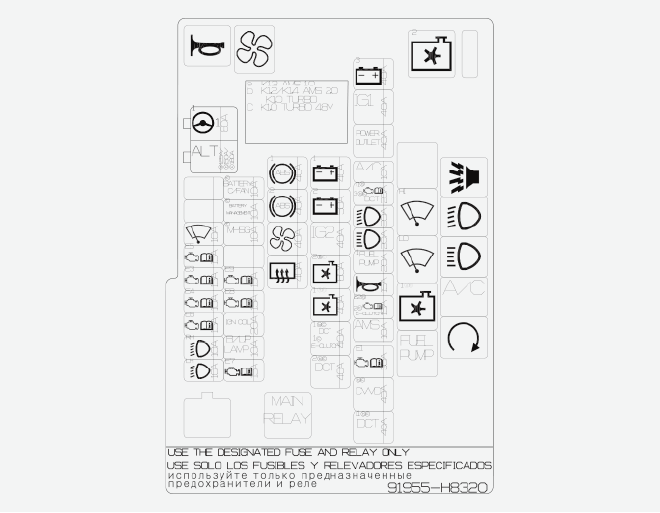 Панел с предпазители в машинното отделение (Smartstream G1.0 T-GDi/Smartstream G1.0 T-GDi 48V HEV PTC само нагревател)