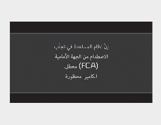 عند تغطية الكاميرا بالأتربة أو الثلج أو المخلفات، قد لا يتمكن تشغيل نظام المساعدة على تجنب الاصطدام من الجهة الأمامية من اكتشاف المركبات الأخرى. وفي هذه الحالة، ستظهر رسالة تحذير لتحذير السائق.