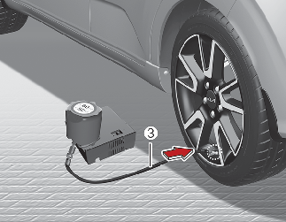 عند وجود الزر ENGINE START/STOP (بدء تشغيل/إيقاف المحرك) في الوضع on (تشغيل) أو مفتاح الإشعال أو الزر ENGINE START/STOP (بدء تشغيل/إيقاف المحرك) في الوضع on (تشغيل)، شغل الضاغط واتركه يعمل لمدة من 5 إلى 7 دقائق لملء مانع التسرب حتى يصل إلى الضغط المناسب. (ارجع إلى تفاصيل أكثر). يُعد ضغط نفخ الإطارات بعد ملئها غير مهم وسيجري فحصه/ تصحيحه لاحقًا.