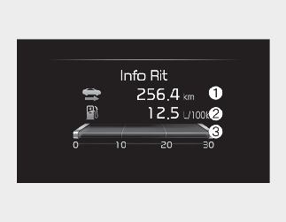 Het display toont de geaccumuleerde ritafstand (1), het gemiddelde brandstofverbruik (2) en het actuele brandstofverbruik (3) en de totale rijtijd (4).