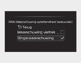 Home > Met uw auto rijden > Waarschuwingssysteem voor de aandacht van de bestuurder (DAW) > Instelling Driver Attention Warning (Waarschuwing oplettendheid bestuurder) (Behalve CUV)