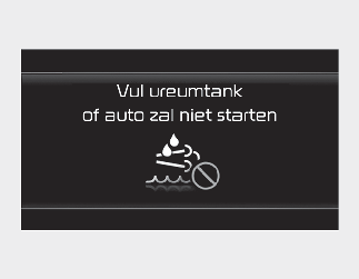 Wanneer de melding "Refill Urea tank or vehicle will not start" (Vul ureumtank of auto zal niet starten) met het SCR-waarschuwingslampje () wordt weergegeven, kan het voertuig niet opnieuw worden gestart nadat de motor is uitgeschakeld met de toets ENGINE START/STOP (Motor starten/stoppen). In alle bovengenoemde gevallen wordt volledig bijvullen aanbevolen.