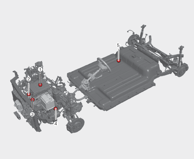 Batería de alto voltaje (polímero de iones de litio): Almacena y suministra la electricidad necesaria para la operación del vehículo eléctrico (una batería auxiliar de 12 V suministra electricidad al equipamiento del vehículo, como las luces y los limpiaparabrisas).