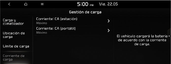 Puede ajustar la corriente de carga para un cargador de CA. Seleccione una corriente de carga adecuada para el cargador utilizado.