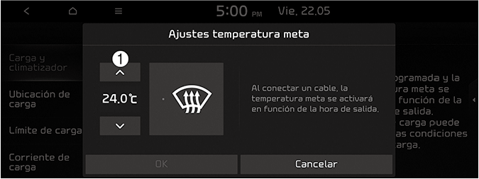 Seleccione "EV (vehículo eléctrico) → Charge management (gestión de la carga) → Reserved charging and Climate Control (carga reservada y control del climatizador) → Reserved climate control (control del climatizador reservado) → Ajustes de temperatura objetivo" en la pantalla.