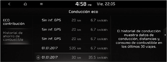 Puede comprobar la fecha de conducción, la distancia de conducción y el consumo promedio de energía de los últimos 30 viajes. La fecha con el ECO mayor se indica con un icono en forma de estrella.