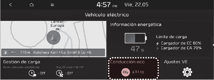 Seleccione "EV (vehículo eléctrico) → ECO Driving (conducción ECO)" en la pantalla.