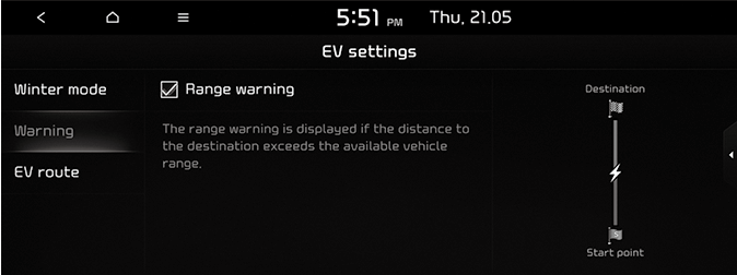 You can apply electric car-related functions for guiding the route. It allows you to check the distance that you can go with the current battery amount. Travelable and non-travelable sections on your way to the destination are displayed on the screen. The search station icon is also displayed so that you can find nearby stations immediately.