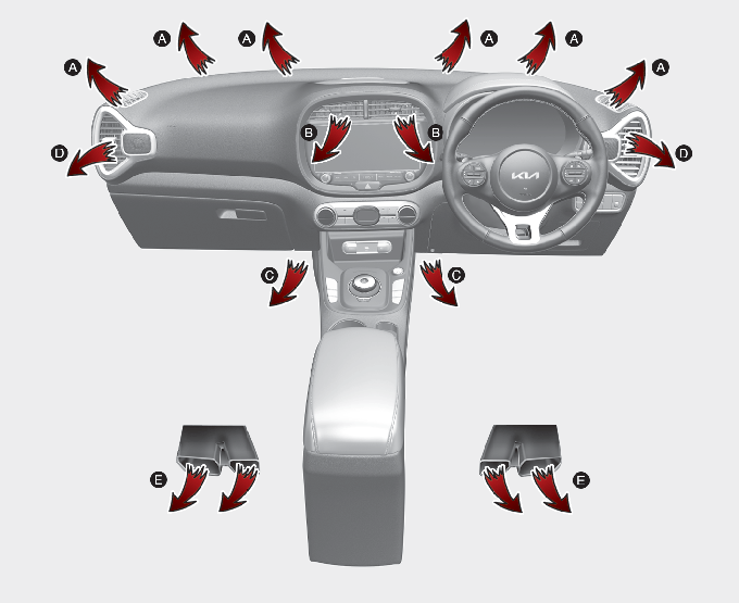 The air flow of the 2nd row outlet vents is controlled by the front climate control system and delivered through the inside air duct of the floor (E).