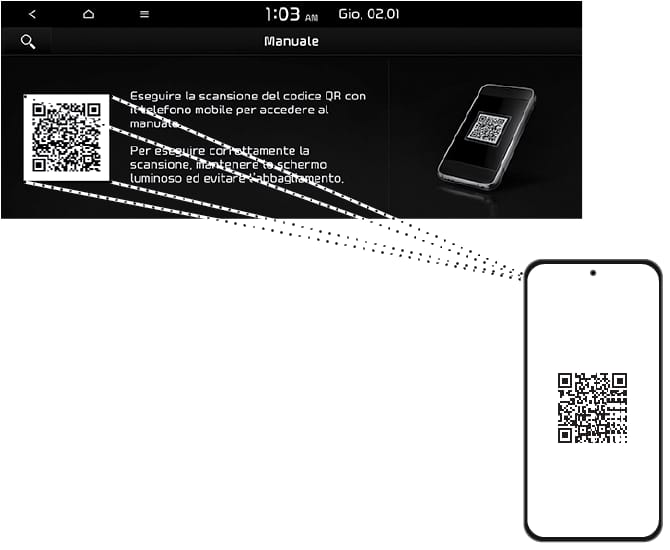 Scansione del codice QR : Premere [SETUP] > [Generale] > [Informazioni di sistema] > [Manuale online]. Effettuare la scansione del codice QR, poi toccare l’URL nel codice per accedere alla pagina web.