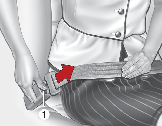 يتحرر حزام الأمان بالضغط على زر التحرير (١) في إبزيم الغلق. بعد تحريره، يجب أن يعود الحزام آليًا إلى الضام. وإذا لم يحدث ذلك، فافحص الحزام للتأكد من عدم التوائه، ثم أعد المحاولة مرة أخرى.