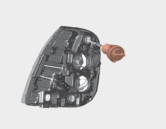 قم بإزالة مقبس اللمبة من مجموعة المصابيح الأمامية بإدارة المقبس عكس اتجاه عقارب الساعة حتى تتم محاذاة الألسنة بمقبس اللمبة مع فتحات مجموعة المصابيح الأمامية.