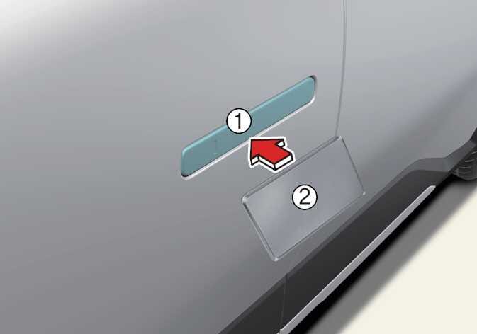 Se il conducente appoggia l’antenna NFC della chiave magnetica 2 registrata sulla piastra di autenticazione (1) della maniglia della portiera del conducente o del passeggero per più di 2 secondi, la portiera si bloccherà o si sbloccherà.