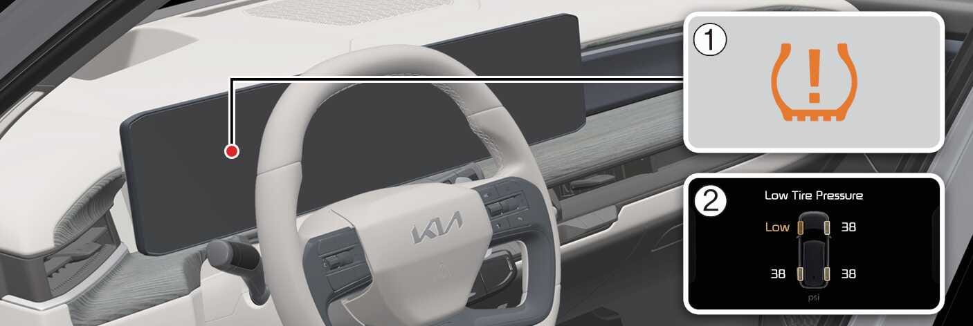 Come sicurezza aggiunta, il veicolo è stato dotato di un sistema di controllo della pressione degli pneumatici (TPMS) che accende una spia per bassa pressione quando uno o più pneumatici hanno un gonfiaggio decisamente insufficiente. Quando si accende questa spia, dovete quindi fermarvi, controllare gli pneumatici il più presto possibile e gonfiarli alla pressione corretta. Guidare su uno pneumatico notevolmente sgonfio provoca il surriscaldamento dello pneumatico che potrebbe portare alla sua rottura. Un gonfiaggio insufficiente riduce inoltre l'efficienza del consumo di energia elettrica e la vita del battistrada e può compromettere la manovrabilità del veicolo e la capacità di arresto.