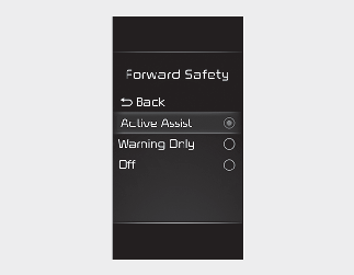 If 'Active Assist' is selected, the function will warn the driver with a warning message and an audible warning depending on the collision risk levels. Braking assist will be applied depending on the collision risk.