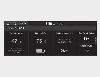 Das Menü des Plug-in-Hybrid besteht aus fünf Abschnitten: [EV-Reichweite], [Energieinformationen], [Lademanagement], [Wirtschaftliche Fahrweise], [Energiefluss].