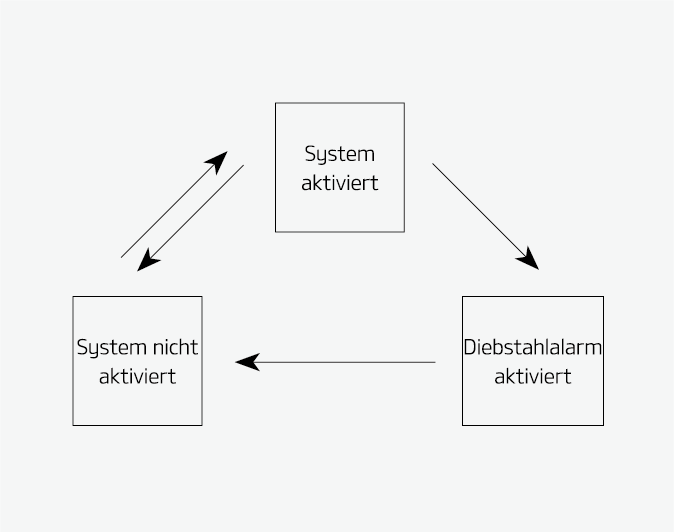 Das System ist so konzipiert, dass es vor unbefugtem Zutritt zum Fahrzeug schützt. Das System kennt drei Zustände: Der erste Zustand ist „Aktiviert“, der zweite Zustand ist „Diebstahlalarm“ und der dritte Zustand ist „Deaktiviert“. Wenn eine Auslösung stattfindet, gibt das System akustischen Alarm und schaltet gleichzeitig die Warnblinker ein.