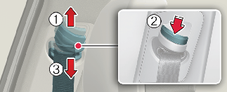 To lower it, push it down (3) while pressing the height adjuster button (2).