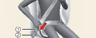 Pull it out of the retractor and insert the metal tab (1) into the buckle (2).