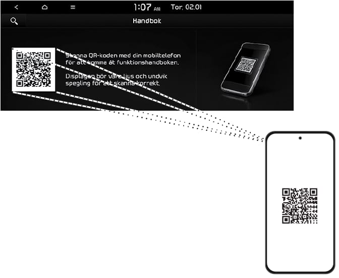 Skanna qr-kod : Tryck [SETUP] > [Allmänt] > [Systeminfo] > [Online manual]. Skanna QR-koden, tryck på webbadressen i koden för att gå till webbsidan.