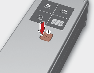 Laddströmmen förändras, när man trycker på knappen (1) i mindre än 1 sekund med laddkabeln kopplad till ett elektriskt uttag men inte till bilen. ![]() |