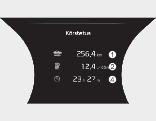 Denna display visar färdsträckan (1), genomsnittlig bränsleförbrukning (2) och den aktuella bränsleförbrukningen (3) samt total körtid (4). Informationen uppdateras en gång per en tändcykel.