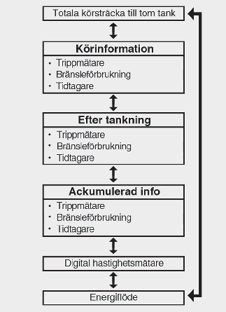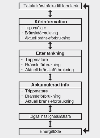 Denna display visar den ackumulerade färdsträckan (1), den genomsnittliga bränsleeffektiviteten (2), den aktuella bränsleförbrukningen (3) och total körtid (4) efter tankning.