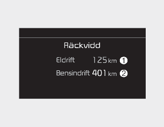 Räckvidden är det beräknade avståndet som fordonet kan köras med den återstående laddningen i högspänningsbatteriet (hybrid) (1, El) och bränslet i bränsletanken (2, bensin).