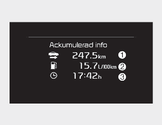 Denna display visar den ackumulerade färdsträckan (1), den genomsnittliga bränsleeffektiviteten (2) och den totala körtiden (3) efter tankning.