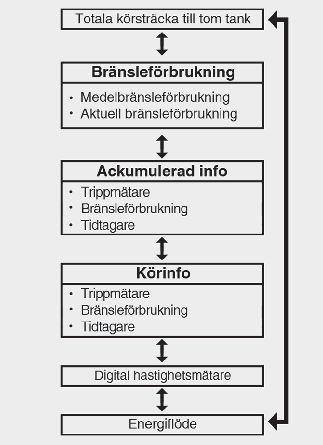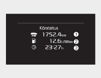 Denna display visar färdsträckan (1), genomsnittlig bränsleförbrukning (2) och total körtid (3) informationen uppdateras en gång per tändcykel.
