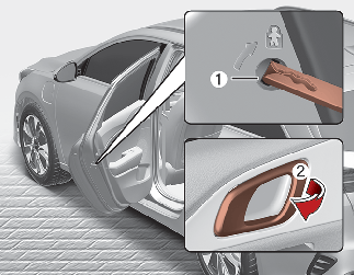 ) läge för att låsa barnspärren (1). När barnspärren är låst öppnas inte bakdörrarna när någon drar i det inre dörrhandtaget(2).